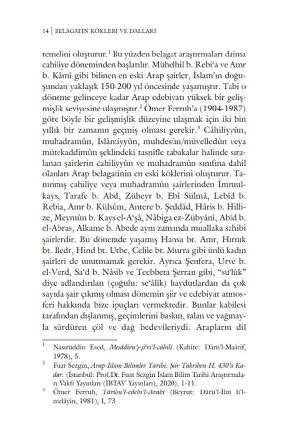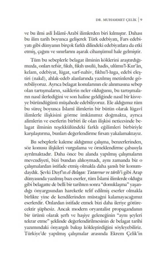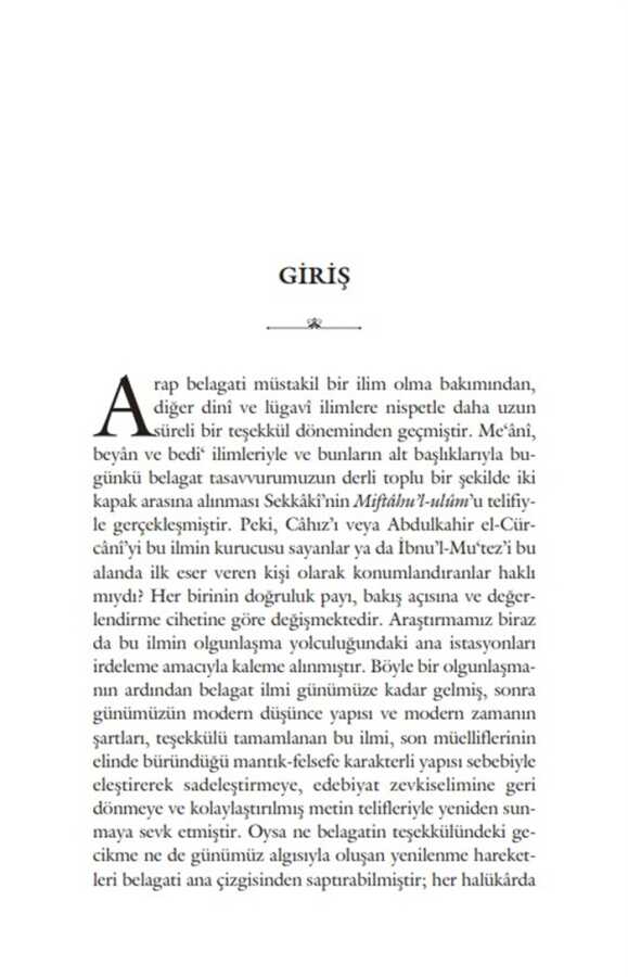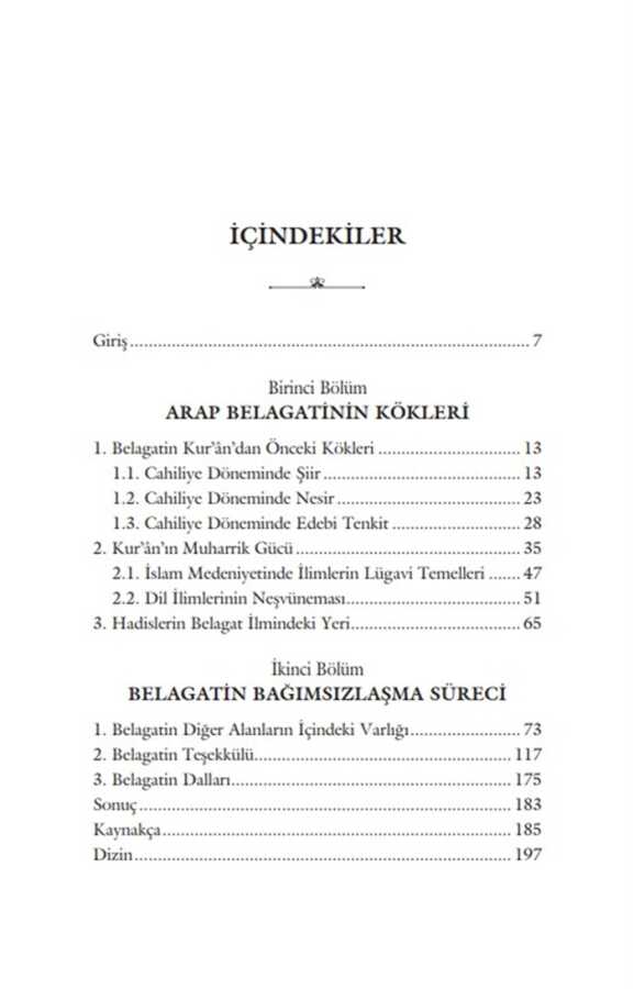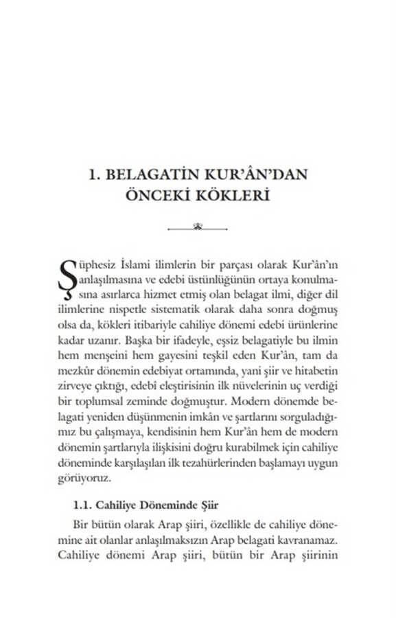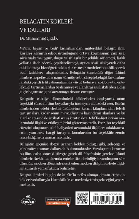 Meânî, beyân ve bedî‘ kısımlarından müteşekkil belagat ilmi, Kur’ân-ı Kerîm’in edebi üstünlüğünü ortaya koymasının yanı sıra, sözü makama uygun, doğru ve anlaşılır bir şekilde söylemeyi, farklı yollarla ifade ederek çeşitlendirmeyi, ayrıca sözü süsleyerek daha etkili kılmayı bize öğretmekte, şiir ve nesir metinlerini tahlil ederek belli kaidelere ulaşmaktadır. Belagatın teşekkülü diğer İslâmî ilimlere nispetle daha uzun sürmüş ve bu süreçte belagat farklı alanlardaki çeşitli telif çalışmalarında vücut bulmaya, çok boyutlu entelektüel tartışmalardan beslenmeye ve alanlararası ilişkilerden aldığı güçle bağımsızlığını kazanmaya devam etmiştir.Belagatın cahiliye dönemindeki köklerinden başlayarak onun teşekkül sürecini tüm boyutlarıyla inceleyen elinizdeki eser, Kur’ân ilimlerinden edebi eleştiri ürünlerine, kelam kitaplarından felsefi tartışmalara kadar onun mevcudiyetini barındıran alanlara ve bu alanlar arasındaki irtibatlara ışık tutmakta, telif faaliyetlerinin aralarındaki ilişki ve etkileşimlerini göstermektedir. Eser, bu teşekkül sürecini oluşturan telif faaliyetleri arasındaki ilişkilere odaklanmasının yanı sıra, hangi tartışma konularının bu teşekküle zemin hazırladığını da araştırmaktadır.Belagatın geçmişe doğru uzanan kökleri olduğu gibi, geleceğe ve günümüze uzanan dalları da bulunmaktadır. Varoluşunu kazanan bu ilim, daha sonraki süreçte gerek dil felsefesinin gerekse İslamî ilimlerin farklı alanlarında entelektüel derinliğiyle varoluşunu sürdürmüş, modern dönemde neşet eden modern disiplinlerle de ilişkiler kurarak yeni ufuklara açılmıştır.Belagat ilimleri bugün de Kur’ân’la nefes almaya devam etmekte, kökleri ve dallarıyla İslam kültür ve medeniyetinin geleceğini yeşertmektedir.